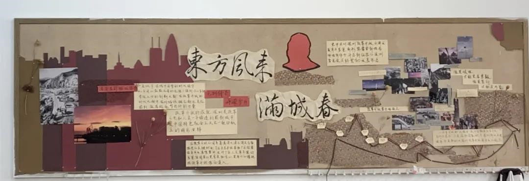 此次黑板报的制作紧密围绕深圳从改革开放至今的成果开展,主题"东方风来满城春"体现党中央对深圳寄予厚望。错落排列的黑白照片映出深圳自上世纪以来艰苦卓绝的发展历程,板报上图钉、布网等元素更是象征着深圳人民勤劳勇敢的美好精神。