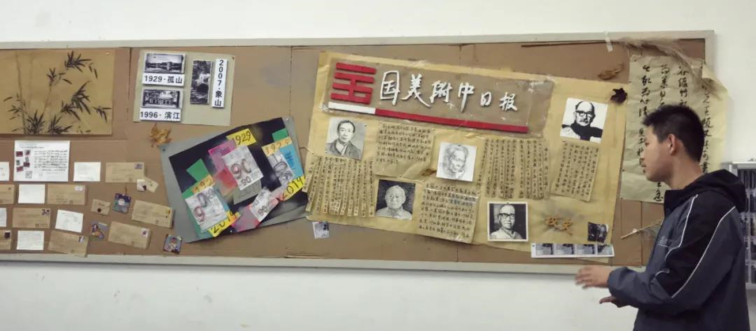 当我们拿到这个主题时第一想法就是以三个不同时期的报纸作为主体,来表达不同阶段的校史。在色调上,我们采用暖色调以及参考了莫兰迪的油画作品进行配色。我们以最大的一个板块来介绍在漫漫校史长河中几位具有代表性的校友;并用较小的两张报纸来介绍校址的迁移和不久前90周年校庆的盛况。我们还以许多同学写给未来的自己或学校的信封来表达 “校史不仅是面向过去,更是面向未来,面向我们”这一主旨。