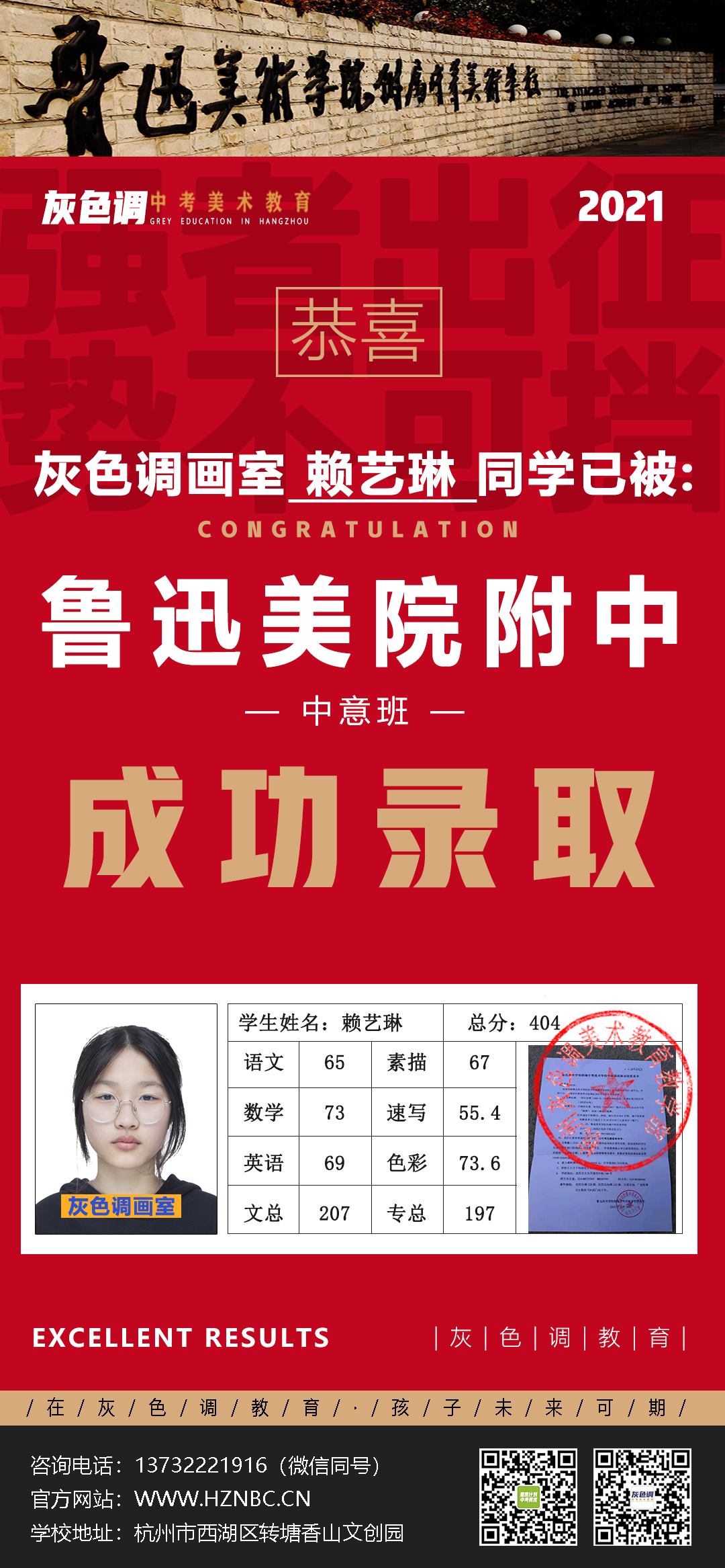 热烈祝贺杭州灰色调画室余泓蔓同学