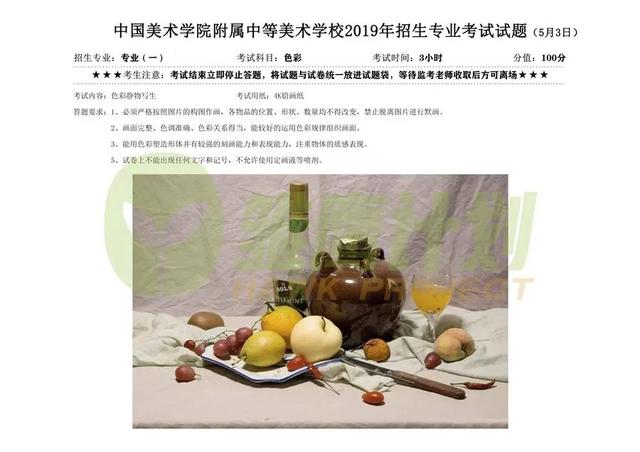 色彩:静物写生(13:30—16:30),一个棕色陶罐,一个玻璃酒瓶、一个白盘子上水果若干,一把水果刀 、白色衬布一块、浅紫色衬布一块