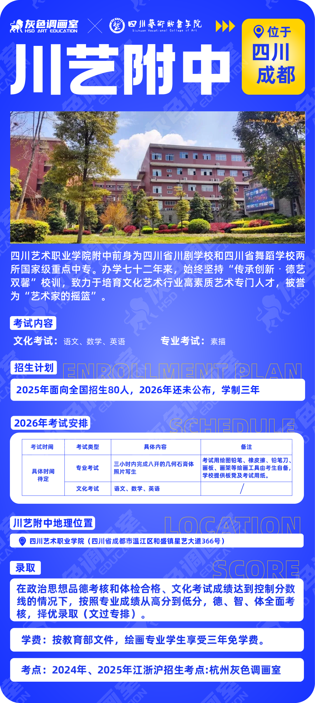 四川艺术职业学院附中2026年考试安排:具体考试时间待定,专业考试:三小时内完成八开的几何石膏体照片写生;注意考试用绘图铅笔、橡皮擦、铅笔刀、画板、画架等绘画工具由考生自备,学校提供板凳及考试用纸。