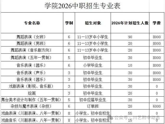 (二)报名时间:2026年3月—4月。登录四川艺术职业学院网站的附中招生报名系统报名(http://zs.scapi.mcitedu.cn/),考生信息填报完成后务必选择要报考的专业,报名结束前考生可以修改专业志愿,考试前3天至考试当日考生可以登录系统打印《四川艺术职业学院2026年附中招生考生报名表》。