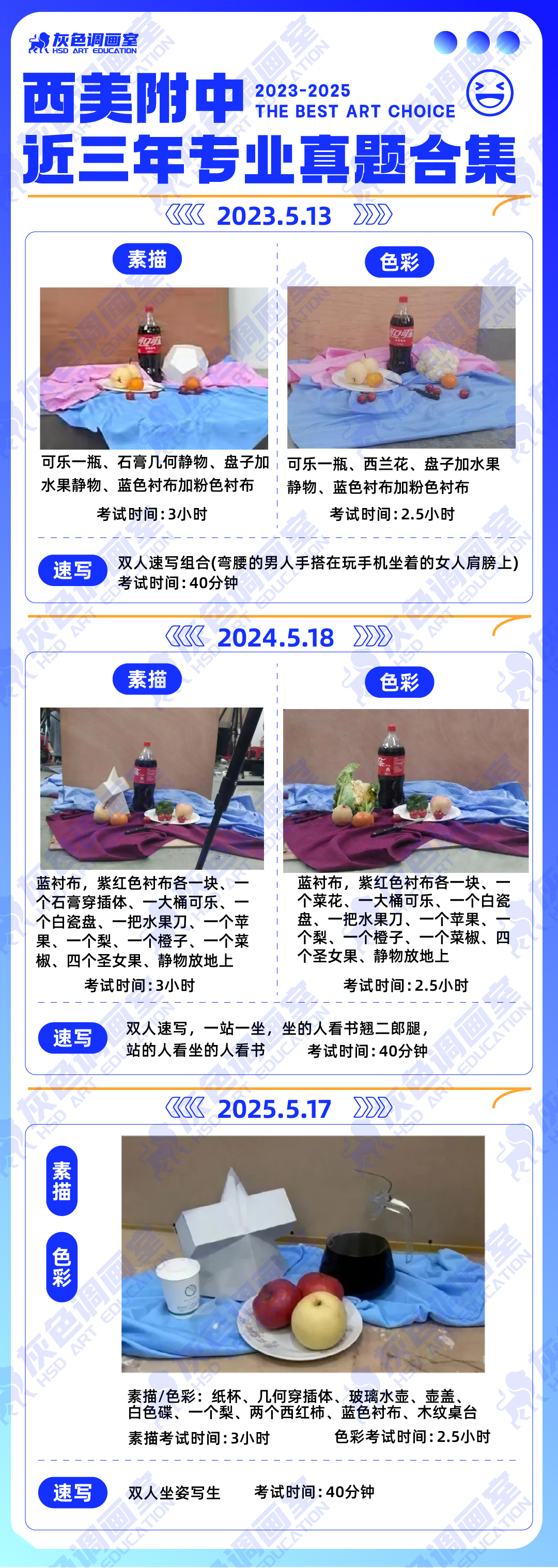 色彩:可乐一瓶、西兰花、盘子加水果静物、蓝色衬布加粉色衬布,考试时间:2.5小时;